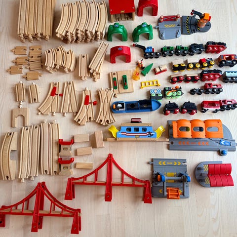 BRIO Togbane Legetøjssæt i træ med forskellige tog, vogne og skinner, sporskiftere, bruger, tuneller elektriske toge, alm toge og meget mere. Kassen det er i måler 56x39x42 ( blot for at gå en ideen om mængden af brio). Kasserne medfølger ikke.