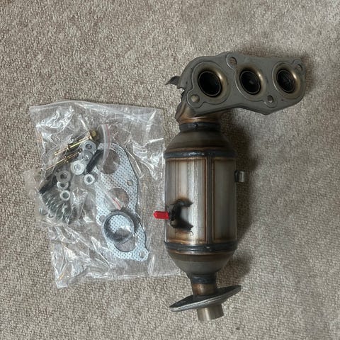 Splinter ny katalysator (foran) med befæstelsesmatriale og monteringsdele
