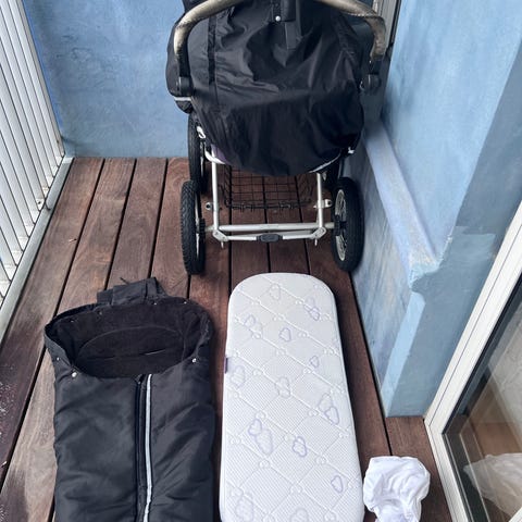 Sele og madras følger med Farven er grå og har synlige brugspor men fungerer upåklageligt som altanbarnevogn.