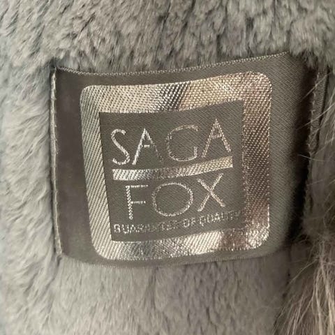 Saga fox pels af ræv. Jakken er lys og designet til kvinder i størrelse S. Jakken har lommer og en detalje ved ærmerne i ruskind.