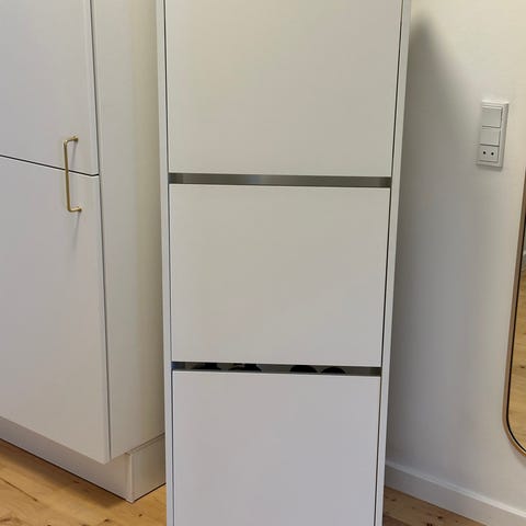 Hvidt skoskab med to låger til opbevaring af sko. Skabet har en kompakt størrelse og er designet til at spare plads. Materialet er træ eller træbaseret. Skabet har en enkel og funktionel konstruktion med hylder bag lågerne.