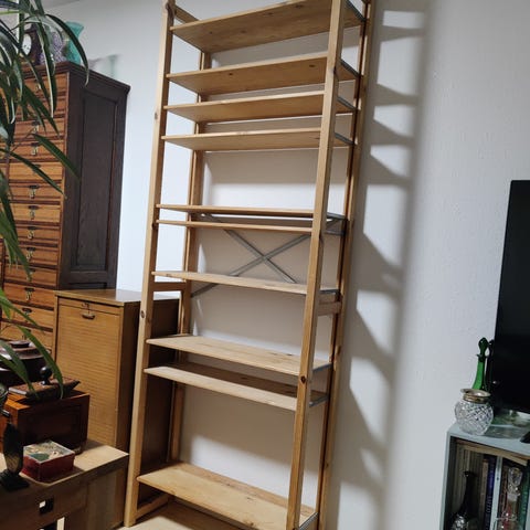 Flot og solid stigreol i ludbehandlet træ. Reolen har 2 fag med i alt 10 hylder og giver masser af opbevaringsplads. Blevet opbevaret tørt og lugtfrit i udstilingslokale.