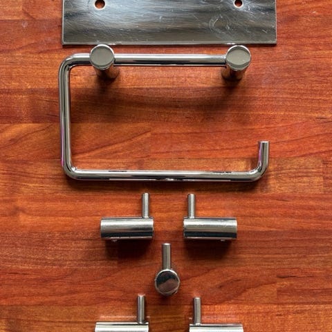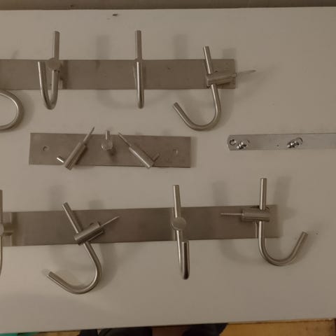 Fede knager i to størrelser og toiletrulleholdere i massivt børstet stål i tung lækker kvalitet.