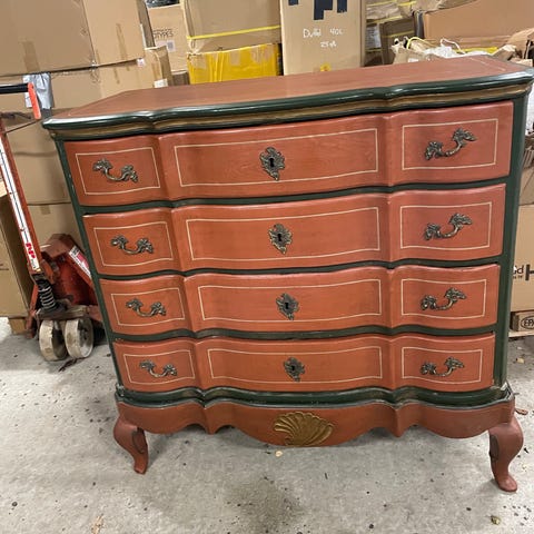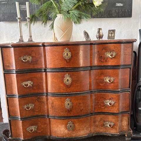 Smuk gammel massiv egetræs familiearve dragkiste med 4 skuffer med messing håndtag.
