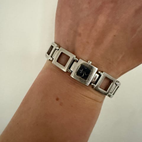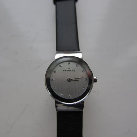Skagen smykkeur i æske. Rem 18 cm. Urskive 1,4×1,4 cm skal ha nyt batteri