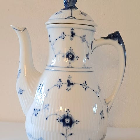 Jubilæumsstellet - Blå Nellike. B&G Kaffekande med låg i porcelæn med blå og hvide blomsterdekorationer. Kanden har et klassisk design og er velegnet til servering af varme drikke. Som ny og fejlfri.