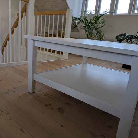 Et fint hvidt sofabord med brugsmærker.