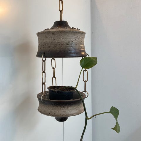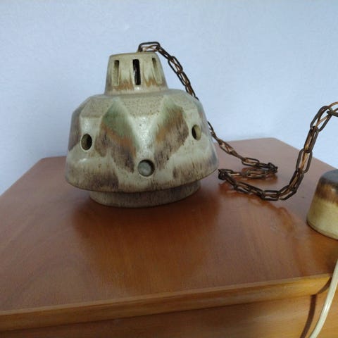 Fin gammel keramik hængelampe med kæde til ophængning og skjuler. Lampen måler D 31 cm H 24 cm. Er Ca 50 år gammel, keramikens logo er mig ukendt, vejer Ca 5 kg men kan kun sendes som 15 kg pga dim