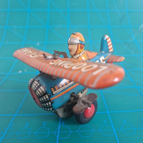 Woody Woodpecker legetøjsfly med rød og gul farve. Fremstillet i metal og plastik. Modellen forestiller et dobbeltvinget fly med en figur af Woody Woodpecker som pilot.