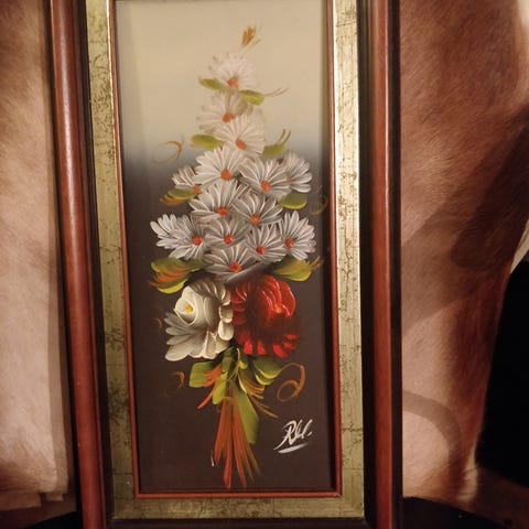 Et gl. og ganske dekorativt lille maleri på træplade, med en pige...