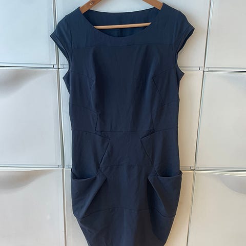 Eksklusiv kjole fra de franske designere MARITHE FRANCOIS GIRBAUD. Kjolen er meget let og super flot på. Kjolen har helt specielle snit, så den falder meget smukt Materialet er mat strækstof i sort med grå diskrete striber- se billeder. -Kjolen er brugt få gange, og fremstår som ny.