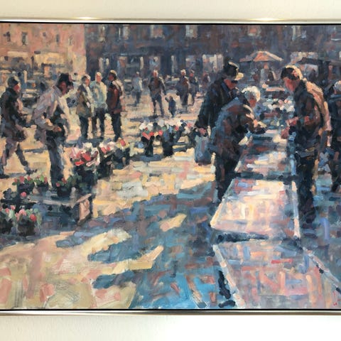 Maleriet er indrammet i en træguldramme og udført med olie på massonit. Motivets farver domineres af grønne og orange toner og stilen er impressionistisk. Lyst og let.
