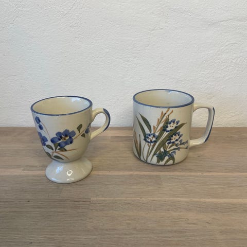3 Tynde porcelænskrus fra Dunoon Ceramics, England/Skotland designet af Cherry Denman. Fra serien Bug Mugs og Beasties. 3 forskellige designs krokodille, mariehøre og edderkop - også med indvendigt motiv. H 14 cm og 11 cm. Et krus med minimalt afslag i bunden.