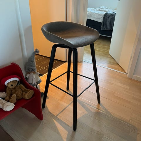 En Høj bar stol med, i pæn stand men med 3 små hakker, i kunstlædet. Købt i jysk, nypris 699 kr.