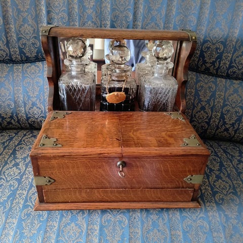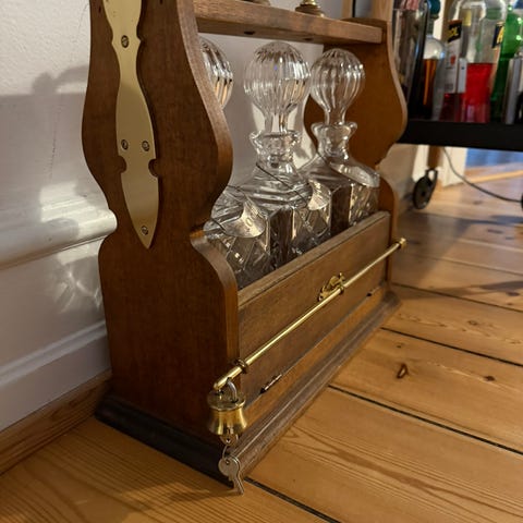 C.S.W.R. glas karaffel sæt bestående af tre klare glas karaffelflasker med mønster, placeret i en træholder med udskåret design og metalplade mærket "H.E. From C.S.W.R. Easter 1895".