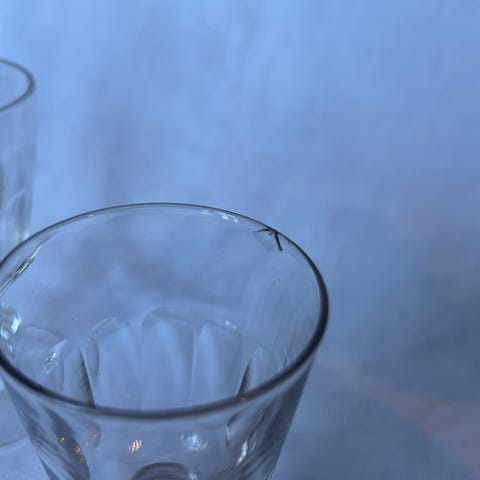 Sæt bestående af 12 messing vinglas med tilhørende to blå fløjlæsker. Hvert glas har en klassisk form og er velegnet til servering af vin. Fløjlæskerne har indre rum til opbevaring og beskyttelse af glassene.