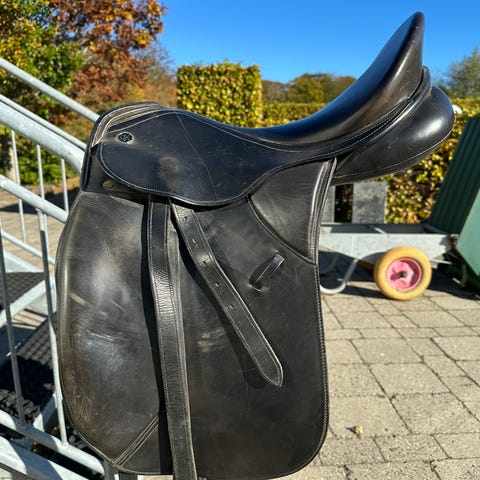 Kieffer Lech, 17 tommer dressur sadel med bøjler og stigeremme, yderst velholdt og minimal slid, altid hængt tørt/varmt, passet med Kieffer læderpleje som medfølger. Pris 1800kr