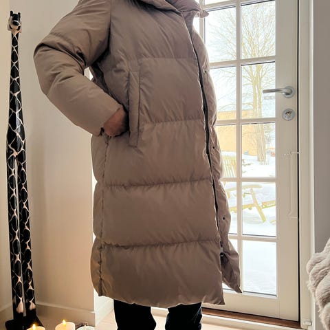Hilfiger dun frakke str XL med aftagelig hætte. Strik vindfang ved ærmer samt vindfang langs lynlås. 2 skrå lommer. Fin stand. Ny renset. Lækker frakke. Længe lige over knæ.