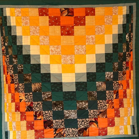 Patchwork tæppe med mønster i grønne og røde nuancer. Tæppet består af firkantede mønstre med blomsterdetaljer og ensfarvet bagside i grøn. Materiale og størrelse ikke oplyst.