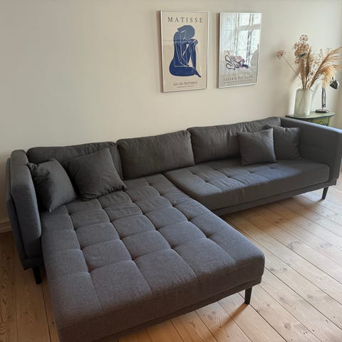 Sælger vores Cali chaiselong sofa, som kun har været brugt i ca. 1 år. Sofaen fremstår i rigtig god stand, uden huller eller slid, men med en enkelt plet, der dog ikke ses for rygpuden. Den har været i et røg- og dyrefrit hjem.