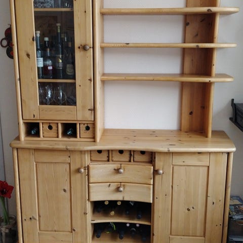 Afsyret fyrretræ, meget rummeligt. To skabe og to skuffer. Selve underdelen måler 95 cm, overdelen med spejl og to små hylder måler 95 cm. Sælges kun på grund af flytning.