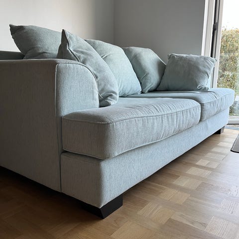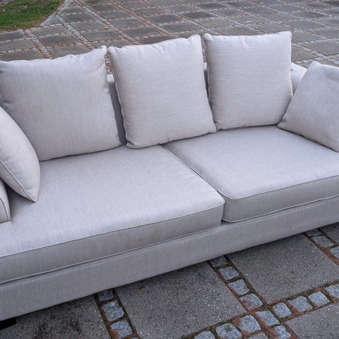 Stilren sofa og samtidig en virkelig lækker flyder. God plads til 3 voksne der sidder. Og masser af plads til 2 i en ske. Bare fjern en eller to af de store puder.