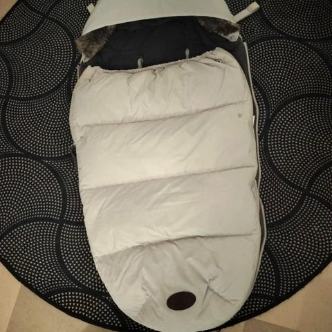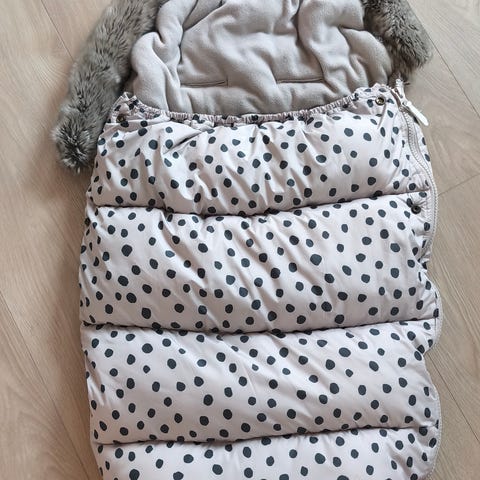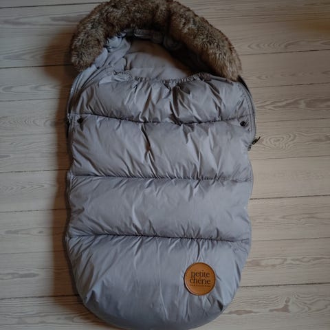 Petite Cherie vognpose i mørkegrå farve med pelskant omkring hætten. Vognposen er polstret for ekstra varme og komfort og har en blød, lys inderside. Designet til at holde barnet varmt i kolde omgivelser.
