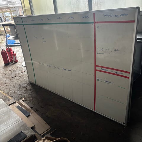 Whiteboard i hvidt træ med glas overflade. Har en robust konstruktion og er designet i en sekskantet form. Whiteboard i høj kvalitet og tungt, B. 150 cm. H. 130 cm.
