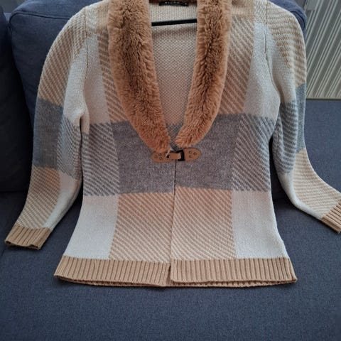 Str. L/ XL, men passer også str. M. Meget speciel. Assymetrisk silhuet. 30 % fox og 70 % lapin.