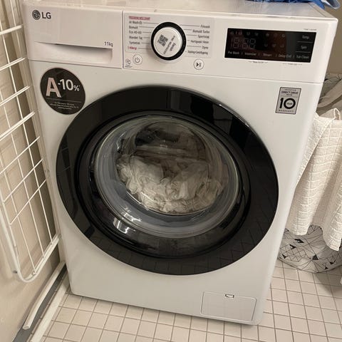 LG Frontbetjent vaskemaskine med frontbetjent design. Maskinen har en rummelig tromle og en brugervenlig betjeningsknap samt digitalt display. Vaskemiddelsskuffen er integreret i fronten for nem påfyldning. Maskinen er hvid og har en moderne, enkel udformning. Maskinen har fået rens hver måned.