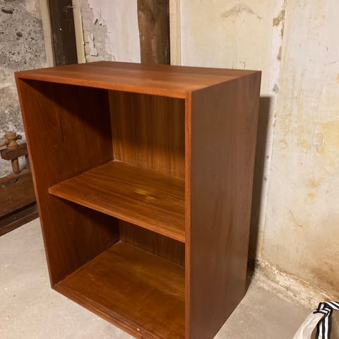 Reol / bogkasse / bogreol i teaktræ / teak. Flytbar hylde. Står flot med naturlig brugsspor og patina.
