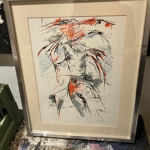 Signeret abstrakt litografi med farverige, ekspressive penselstrøg i gule, blå, sorte og brune nuancer. Kunstværket er indrammet og viser en kombination af geometriske og organiske former. P O Hansen (1927-2020) . Str 51x37 ramme str 72 x 55 Nr 45 /110 . Små pletter på passepartout . Kan sendes på købers regning