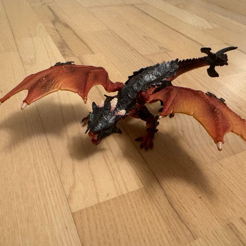 Schleich drage og fantasi dyr legetøj i forskellige farver og designs. Sættet inkluderer fire figurer som en sort drage med ild, en sort og orange skorpion, en orange og rød fuglefigur samt en lilla og sort ulv. Legetøjet er velegnet til børn og kan bruges til fantasifuld leg.