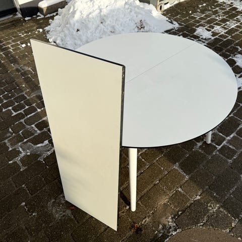 Flot og praktisk rundt spisebord med charcoal linoleum bordplade. Bordet har udtræk, så det nemt kan gøres større, når der er gæster.
