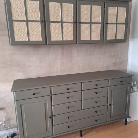 Højt skab og kommode med skuffer i Bøg. Ben af eg / egetræ. Står med brugsspor og patina.