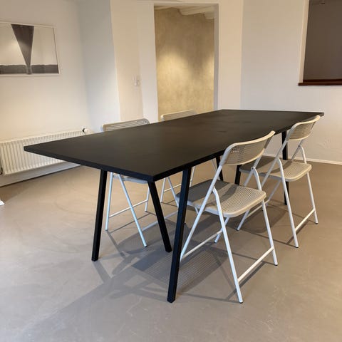 Flot og enkelt spisebord. Sortlakerede metalben og sort bordplade med linoleum på top og sort finer på sider.