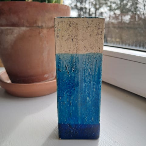 Keramisk vase med blå, grøn og gul glasur. Vasen har et mønster med diamanter og stjerner. Den er cylindrisk i formen og har en glaseret overflade. Flot stand. Nummereret og signeret i bunden.