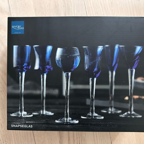 5 forskellige gennemfarvede, mundblæste snapseglas Snapseglassene har forskellige udformninger i farverne lilla, smoke, amber, grøn og gul og indeholder fra 2,5 op til 5 cl.
