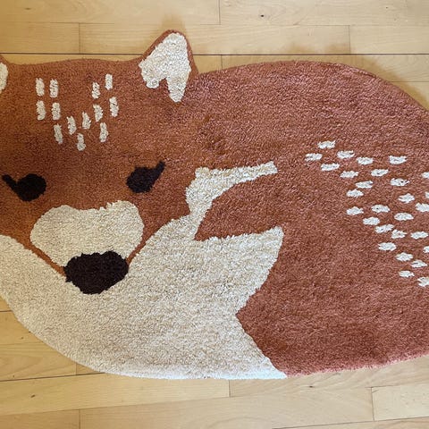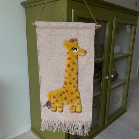Oyoy Giraf børnetapet i beige farve med broderet girafmotiv. Tapetet er lavet af tekstilmateriale og har frynser i bunden. Velegnet til børneværelser som vægdekoration.