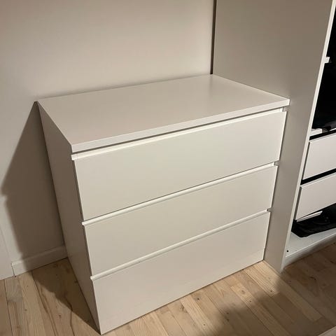 IKEA MALM kommode med 3 skuffer i hvid. Kommoden har et enkelt og funktionelt design, der passer til forskellige rum og opbevaringsbehov.