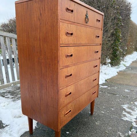 Lækker teak kommode af Dansk møbelproducent fra 1960'erne. Kommoden kommer med tre skuffer og de smukkeste detaljer. Mål: H 68 B: 65 D: 30 cm. Skuffe i højde er 10 cm. Kommoden fremstår i super flot stand uden nævneværdige brugsspor. Skufferne kører perfekt. Kommoden kan leveres i Københavnsområdet for en lille mere betaling.