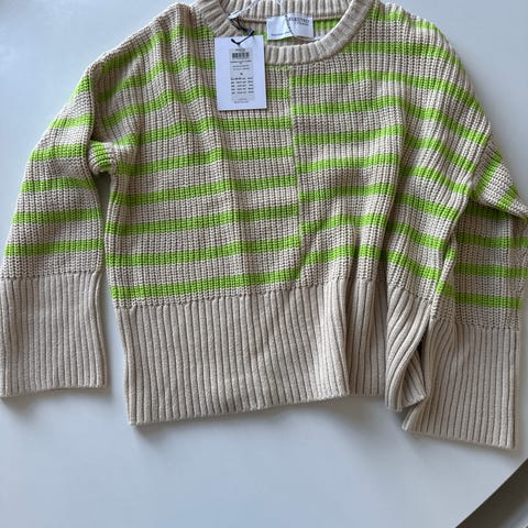 Helt ny strik i grå og lysbeige meleret med tynd guldstriber. 100% uld. Brystvidde ca 100 cm, længde ca 62 cm. Prøvet på - men ellers ikke brugt. Fra dyre og røgfrit hjem