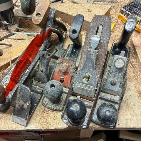 5 af træhøvle og 2 rubank med E. A. Berg Eskilstuna høvlejern.