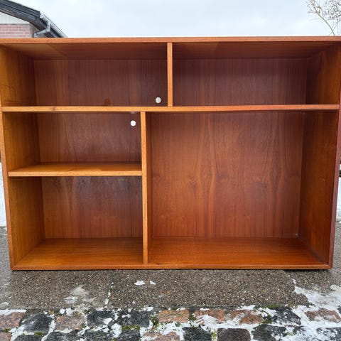 Klassisk reol i teaktræ med skab og hylder. Reolen står rigtig flot og giver et fint udtryk. Den er købt for 2 år siden for 2.000 kr.
