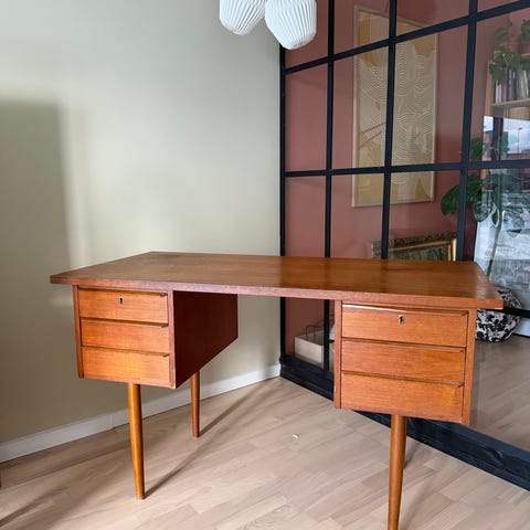 Skrivebord af massiv og fineret teaktræ, front med tre skuffer, runde tilspidsede ben.
