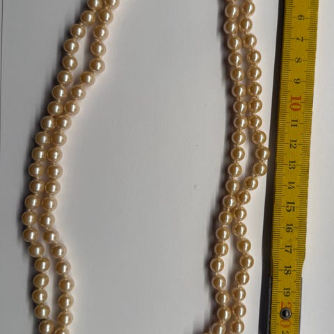 Perlekæden er med fungerende lås. Den har 57 lyse perler og er 56 cm lang