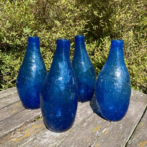 1 blå vase/flaske ca. 27,5 cm, 25 kr. 1 blå vase/flaske ca. 26 cm, 25 kr.