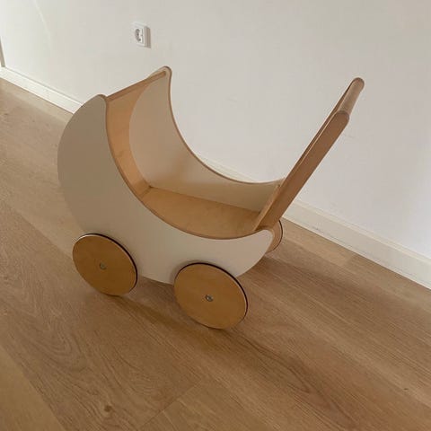 Lækker dukkevogn i træ. Passer perfekt til tøjdyr eller dukker. Der er gummibånd på hjulene så de ikke ridser gulvet. Masser af gode legetimmer tilbage og trænger til et nyt hjem.