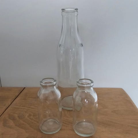 Gamle mælkeflasker i original metalramme med 20 stk. klare ½ ltr. Mælkeflasker. Brug dem evt. som vaser - så er der 20 stk. vaser a kr. 20 pr. Stk.