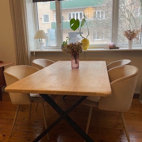 Søger et C62E Bjørk spisebord med tillægsplader i olieret eg.